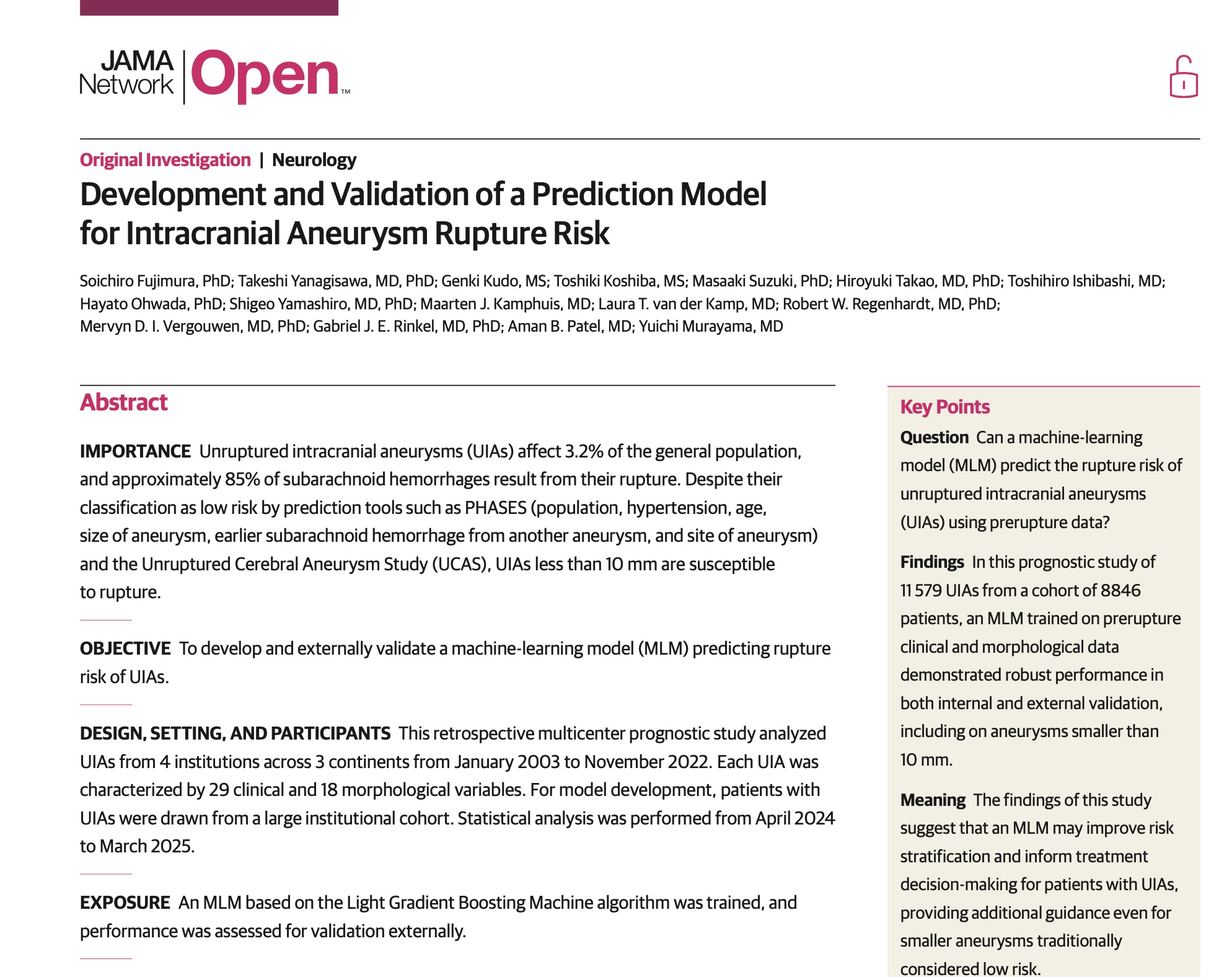 本研究では、患者さんの年齢や血圧、動脈瘤の形などの情報をもとに、人工知能(AI)を活用した予測モデルを開発しました。世界各国の多くの患者さんのデータを用いて検証した結果、このモデルは、動脈瘤が将来破裂する可能性を高い精度で予測できることが分かりました。